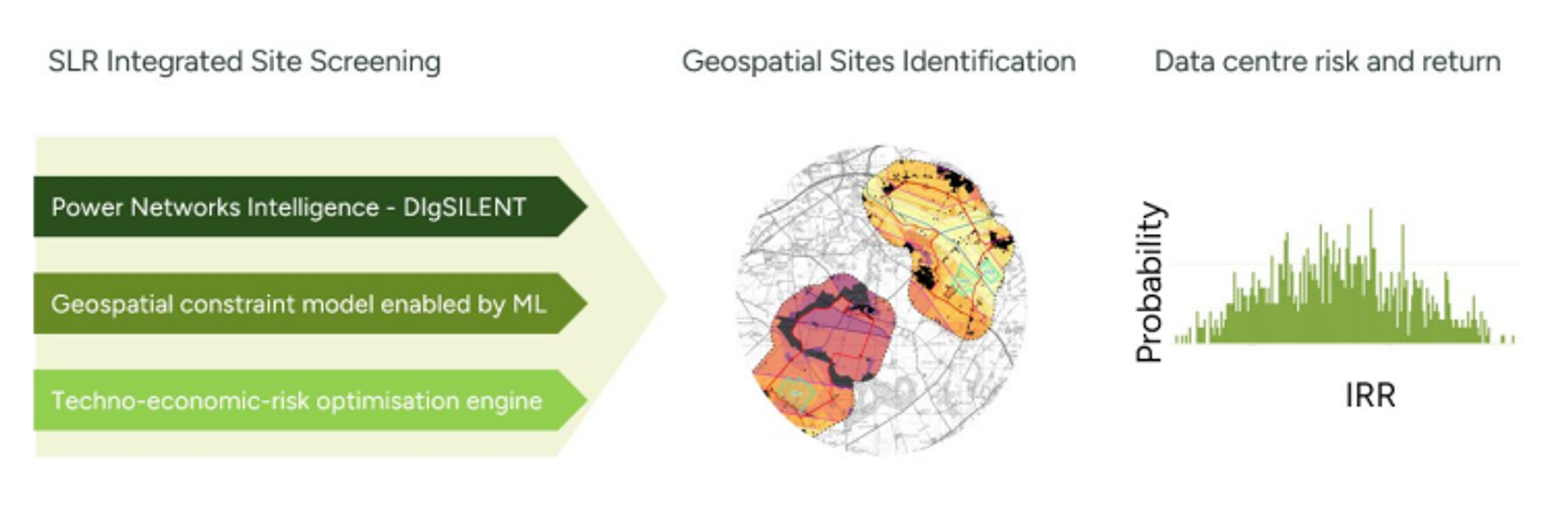 SLR has developed an innovative, integrated, and proprietary combination of site selection services, including grid capacity modelling using DIgSILENT Powerfactory, machine learning-enabled geospatial consentability modelling, and a techno-economic-risk optimisation engine enhanced by Monte Carlo simulation (as presented visually below). Through this service, we can identify viable data centre sites in a fast-track manner that is consistent with the actual grid capacity and the planning framework, and optimise the energy solution. We can also articulate the top three drivers of hyperscaler risk and return.